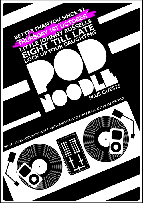 If you missed Pod Noodle last July then fear not my friends. He’s back. For real. With a highly fueled start, stop iPod massacre of sound, expect nothing less than everything you want to hear. Even those songs you think you hate, but deep in your subconscious can’t help but love. Lock up your daughters and get ready for a night of carnage.