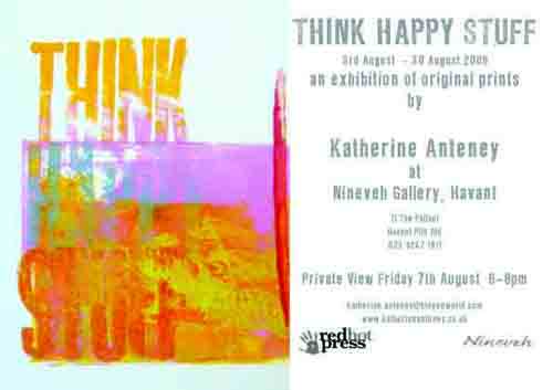 Think Happy Stuff is a solo exhibition of original prints by Southampton artist Katherine Anteney, held at Havant’s Nineveh Gallery. Katherine runs the Redhotpress Print studio in Southampton and is exhibiting a variety of prints framed, mounted, cards and bits and bobs from now up until the 30th of August, with a private viewing this Friday from 6-8pm.