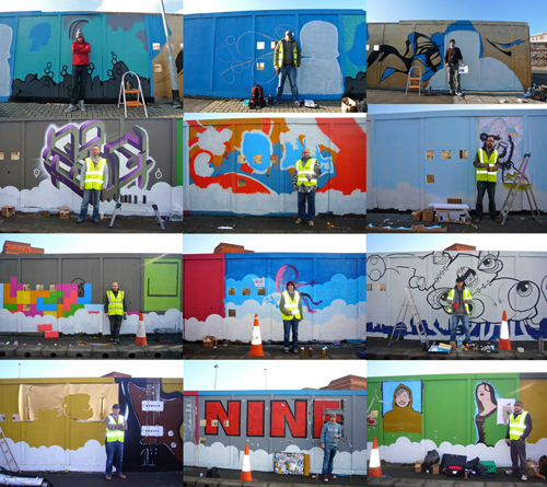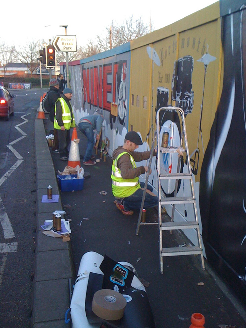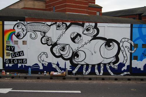 This Saturday and Sunday saw the Portsmouth Creative Movement and associated friends get busy on the derelict land hoarding at Hope Street. The PCM group and Sifer Design gained clearance from Portsmouth Council (who also donated £1000 worth of paint) to paint the whole thing, and believe me, it’s not only freaking huge, but very impressive. Seriously, go check it out.
