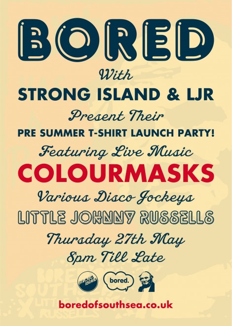 A quick reminder that Bored of Southsea in partnership with Strong Island and The Little Johnny Russells present their Summer T-Shirt Launch Party, featuring LIVE music from The Colourmasks and plenty of earful treats from some of your favourite local DJ’s. In other words a great excuse for a party. Come one, come all. FREE entry tonight.
