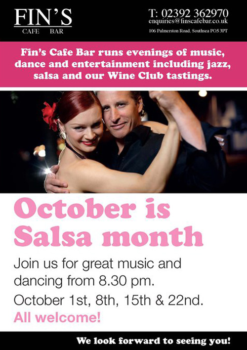 If you fancy trying a little evening salsa since the demise of Havanas, why not pop round to Fin’s Cafe Bar at 106 Palmerston Road in October and enjoy their free salsa night. It’s a small, intimate venue and salsa nights are from 8.30pm on 1st, 8th, 15th and 22nd October. Pop in and see what they have to offer.