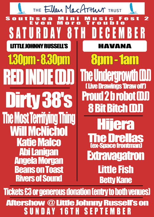 Saturday 15th September saw the first ever Southsea Fest hosted at Little Johnny Russells and Havana which featured The Dawn Chorus, Fresh Legs and Multicoloured Green to name but a few. It was set as a fundraiser for Josie’s brother Beau, to raise money to record an album due to an illness he was suffering and facing a long spell in hospital. After that proceeds went to The Ellen MacArthur trust as they were the first charity to help Beau. They gave him a laptop to record music during his stay in hospital so Josie felt it necessary to make this her chosen charity for Southsea Fest.