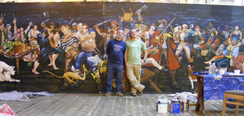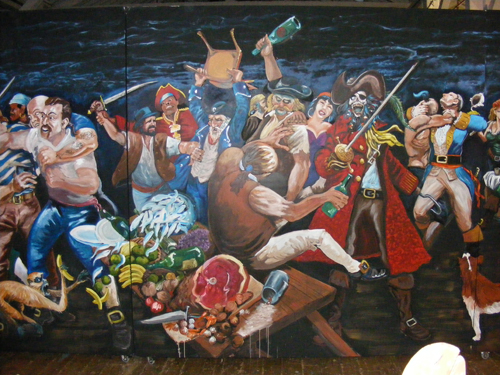 Triffic stuff! Done a big pirate mural myself a few years back. A pirate on his mobile calling for a taxi amongst the mayhem I spect.
