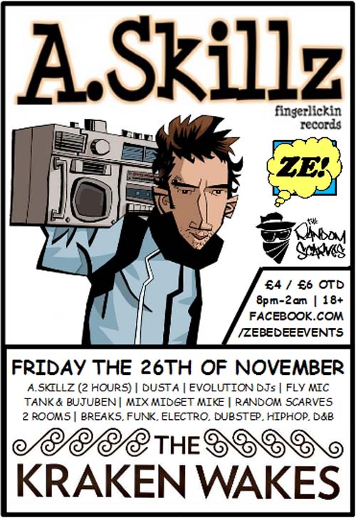 This Friday 26th see A.Skillz throwing down party bangers with everything Funk/Electro/Soul/HipHop/Disco/Breaks to Dubstep. Check out one of his mixes over at the kraken Wakes Podcasts on Mixcloud HERE. All the other details can be found on Facebook.