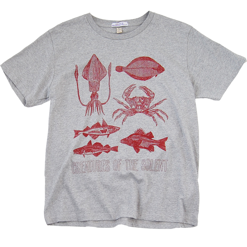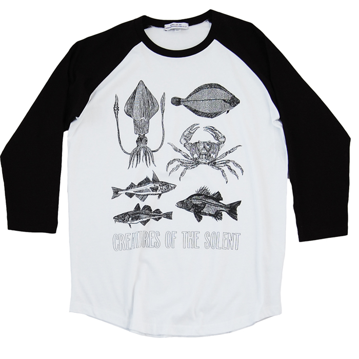 This design is currently offered in a burgundy print on grey marl and also a black print on a white organic cotton tee. For the first time there’s also added a 3/4 length raglan into the mix, black arms, white body with black print. Keep your eyes peeled there may well be more Creatures of the Solent products on the way in the next few weeks.