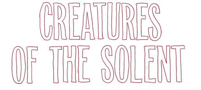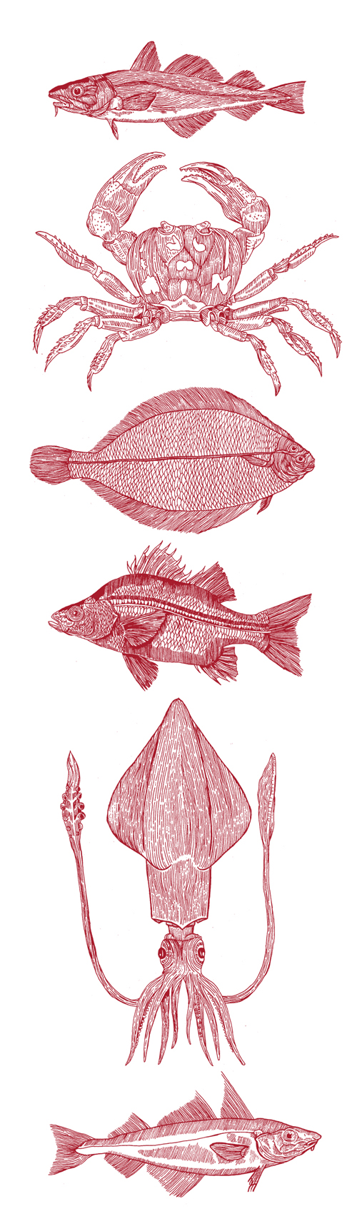 The work ‘Creatures of the Solent‘ features French’s drawings of a Sea Bass, Cod, Crab, Haddock, Plaice and Squid and why not throw a squid in there as times past suggest that there was once a Giant Squid living under the South parade pier here in Southsea. True or false?