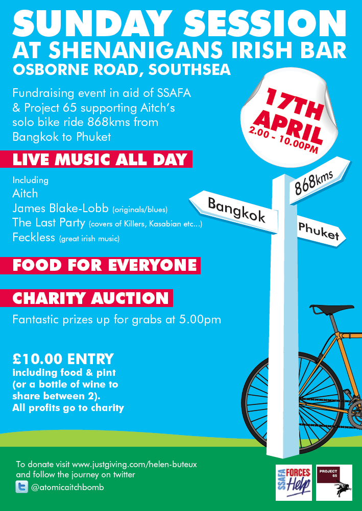 Helen Buteux is doing a solo, unsupported cycle 868km from Bangkok to Phuket on the 21st April, and taking hopefully just 8 days. Wow. All monies raised go direct to the charities SSAFA and Project 65 and she has paid for the trip herself to help maximise donations. Helen is folding a fundraiser at Shenanigans on Osborne Road on the 17th April. Sunday Shenanigans Session is an afternoon/evening with acoustic and Irish bands playing, food etc and everyone is of course welcome.