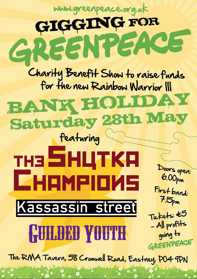 The Gigging for Greenpeace Charity Benefit show is to raise funds for the new Rainbow Warrior III featuring the Shutka Champions, Kassassin Street & Guilded Youth at The RMA tavern, 58 Cromwell Road, Eastney. Tickets are £5 and all proceeds go to Greenpeace