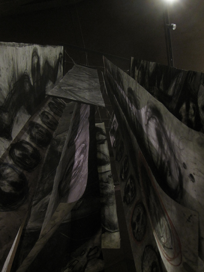 The main installation piece was completed after 4 days of solid charcoal grafting. Hanging from almost the entire length of the gallery floor to ceiling the drapes seemed to breath with the movements of the first visitors to the vernissage.