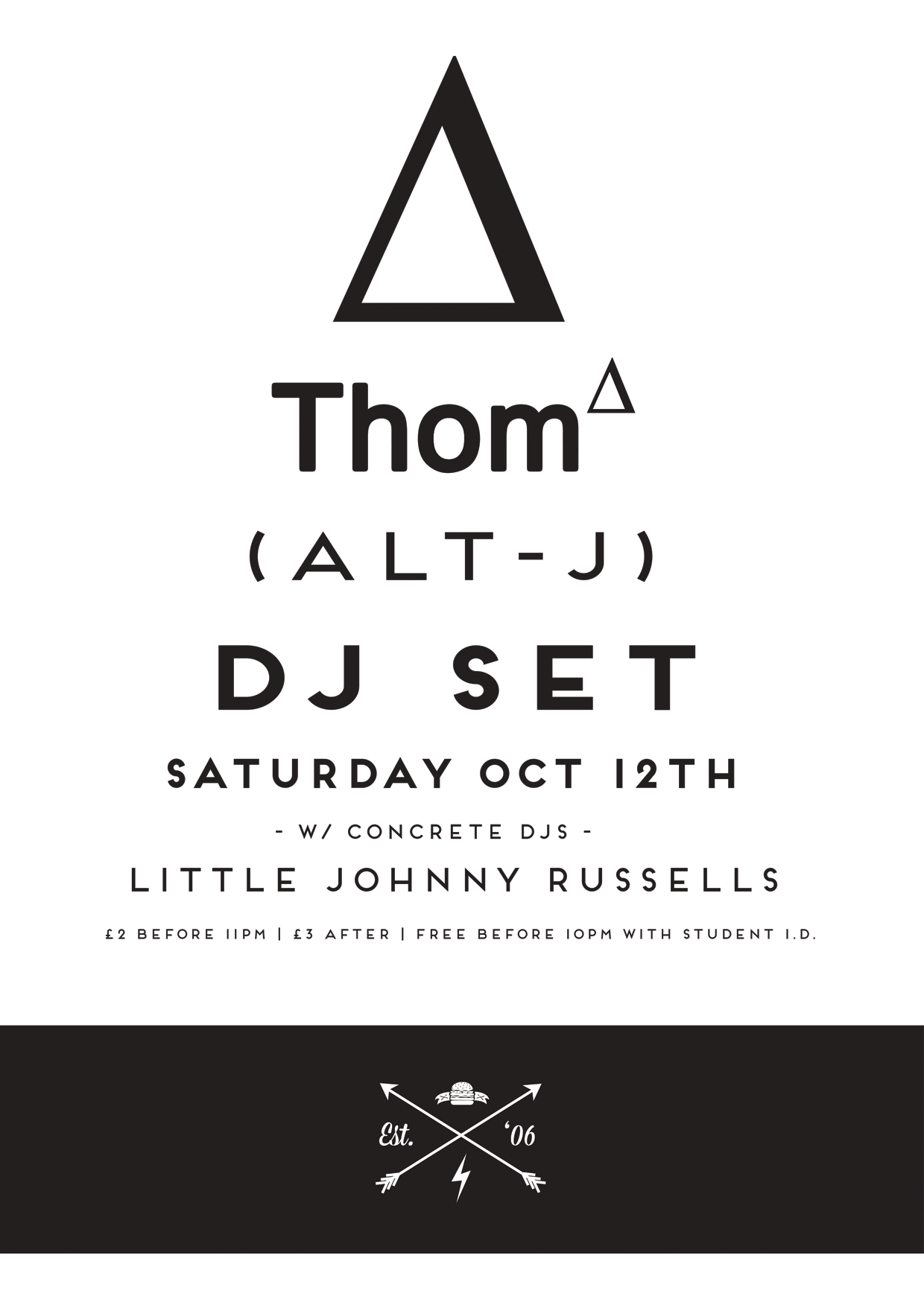 This weekend Little Johnny Russell’s welcome Thom from Δlt-J for a guest DJ slot. Make sure you get down there early to make sure you get a spot as this event is likely to be busy.