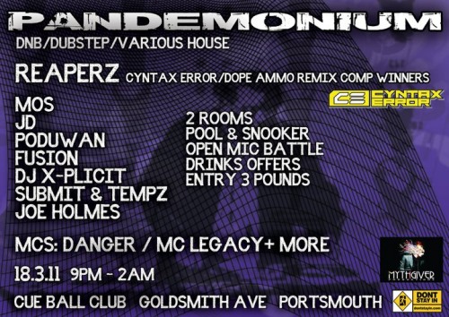 Music & Bands Pandemonium by Paul Gonella 11 March SHARE Facebook Twitter Pinterest Pandemonium is a new Drum ‘n’ Bass night at Cue Ball Club on Goldsmith Avenue, with the first night on 18th March and only £3..